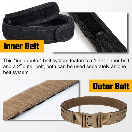 Нейлоновий тактичний ремінь довжиною 5 см забезпечений м’якою знімною внутрішньою вставкою, зручний і не ковзає. Зовнішній ремінь можна легко з’єднати з внутрішнім за допомогою гачка та петлі, а також використовувати окремо як іншу систему ременів. Обидва можна щільно відрегулювати.