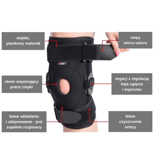 ✅ ПРАКТИЧНИЙ ДИЗАЙН - наколінник м'який і легкий. Має додаткові бічні ребра жорсткості у вигляді шарнірів, які додатково підтримують і розвантажують колінний суглоб. Регулюючи петлі за допомогою годинника, можна обмежити рухливість суглоба. Отвір для колінної чашечки додатково підтримує та утримує колінну чашечку в правильному положенні.