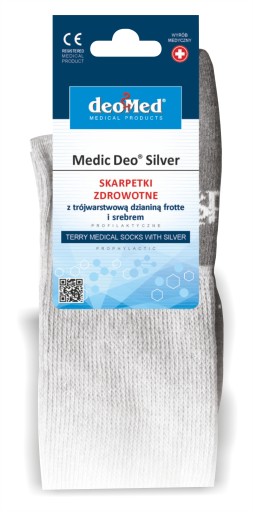 Сучасні оздоровчі шкарпетки Medic Deo® Silver - це медичний виріб найвищої якості від польської компанії JJW. Шкарпетки без тиску зручні, здорові і виготовлені з натуральної бавовняної пряжі з додаванням іонів срібла. Завдяки цьому шкарпетки Medic Deo® Silver можуть служити природною підтримкою в профілактиці та лікуванні різних захворювань стоп і гомілок!