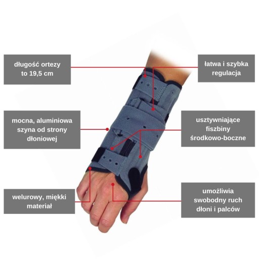 Ортез на зап'ястя з вбудованою шиною та кісточками. Формовані кріплення. Регульована ширина. Дихаючий матеріал. Обмежує рухи зап'ястя. Рекомендується при запальних станах, а також для передопераційної і післяопераційної іммобілізації суглоба. Він доступний у версії для правого або лівого зап'ястя.
