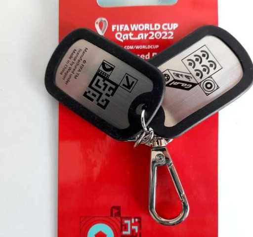 : Пам'ятний брелок з металу та пластику в стилі військових жетонів з намальованими малюнками трофею та офіційним знаком турніру Катару 2022 року на чорному м'ячі. На другій стороні з’являються офіційні графічні мотиви турніру. Брелок поміщений в спеціальну упаковку з голограмою FIFA. Це офіційний сувенір Чемпіонату світу з футболу 2022 року в Катарі.