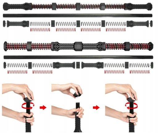 - 2 типи пружин (червона внутрішня з опором 8 кг і чорна зовнішня з опором 12 кг)