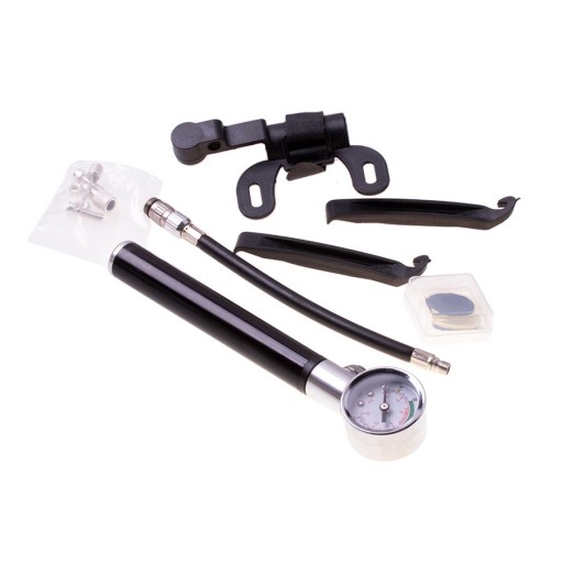 Дуже зручний маленький набір для ремонту коліс велосипеда з дуже міцним металевим насосом, оснащений шлангом і манометром.