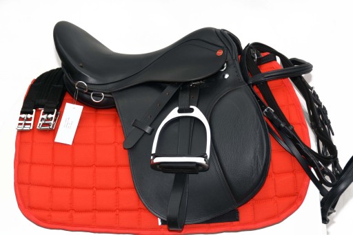Універсальне сідло, у комплекті, 17,5 дюймів - Виготовлене повністю з дуже якісної високоякісної шкіри, сідло дуже легке. Виготовлено на шорно-сідельній фабриці в Англії. Сідло має легку структуру, дерево сконструйовано таким чином, що стегна і особливо тазостегнові суглоби не сприйнятливі до зайвих навантажень, оптимально розміщений центр дозволяє вершнику правильно сидіти. Колінний блок.Єдина така модель сідла за такою низькою ціною.В сідло входить вуздечка + поводи, стремена, підсідельна сумка, сідельне полотно та обхват.