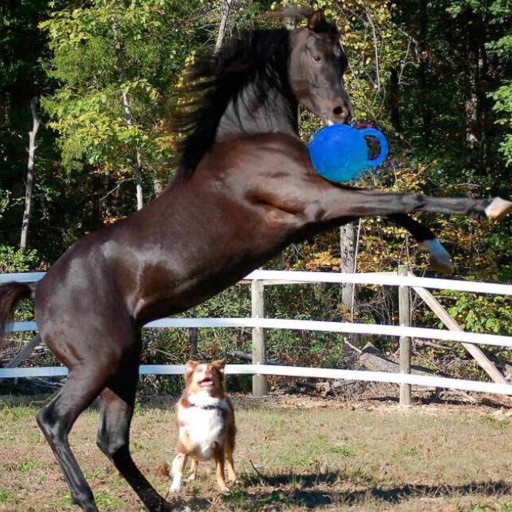Кінь грає в м'яч із фруктовим запахом. Домашня тварина. Весело. Коні. Собаки. Стайня. Випадковий