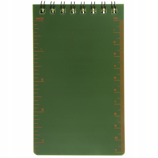 Водонепроникний блокнот, розмір 7,5 х 13 см. Оснащений просоченими аркушами паперу, на яких можна писати нотатки за будь-яких погодних умов. Обкладинка містить вимірювальні стрічки в сантиметрах і дюймах, а також таблиці перерахунку метричних показників.