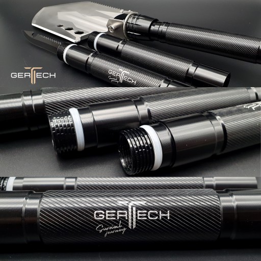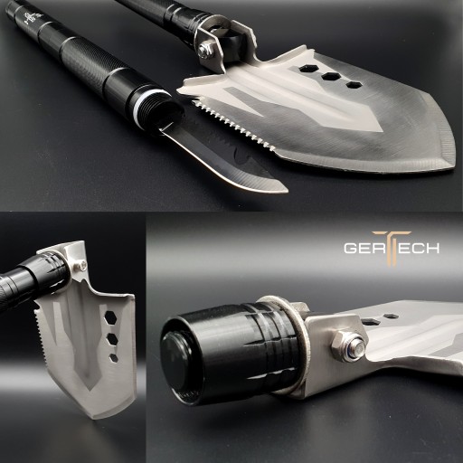 Лопата складається зі сталевого леза (робоча частина) і 3 алюмінієвих елементів, які можна з'єднати разом, щоб утворити древко лопати, загальною довжиною 76 см. Довжина одного елемента рукояті становить 18 см, їх можна вільно комбінувати, щоб сформувати лопату з довжиною рукояті 38 см / 54 см / 76 см. Елементи, які ми збираємо разом, мають ущільнювачі, щоб вода не потрапляла всередину. Кожен з трьох елементів має структуру, яка полегшує утримання лопати. Алюмінієві елементи рукояті лопати після вкручування в них леза утворюють рукоятку ножа. Лопата допрацьована склобієм. Крім того, має кремінь і сигнальний свисток.