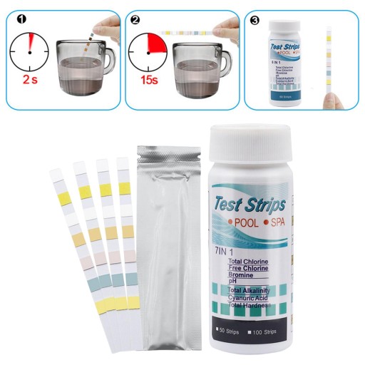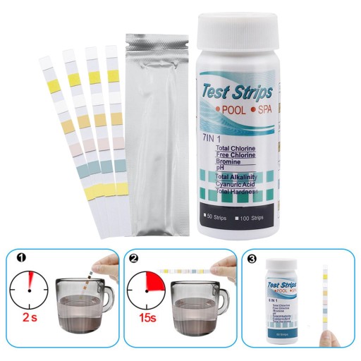 Функціональні тест-смужки 7 в 1, можуть перевіряти: загальний хлор, вільний хлор, бром, PH, загальну лужність, ціанурат, загальну жорсткість.