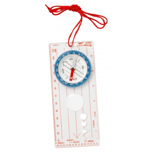Компас зі збільшувальним склом для точного читання деталей на карті. Крім того, він має трикутні та круглі шаблони для позначення знаків на карті.