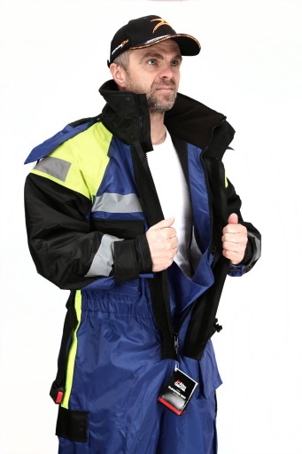 Водонепроникний і вітронепроникний рятувальний костюм, покритий зовні оксфордським нейлоном 420 день. Шви обтягнуті стрічкою з водонепроникною ПВХ мембраною з внутрішньої сторони. Для комфорту комір і кишені обшиті флісом. Щоб захистити обличчя від вітру, можна стягнути капюшон за допомогою шнурка. Світловідбивачі на ногах, руках і голові. Світловідбиваючий жовтий матеріал на плечах і кишенях покращує видимість у темряві. Поставляється в практичній вітрильній сумці. Схвалено відповідно до CE-EN393.