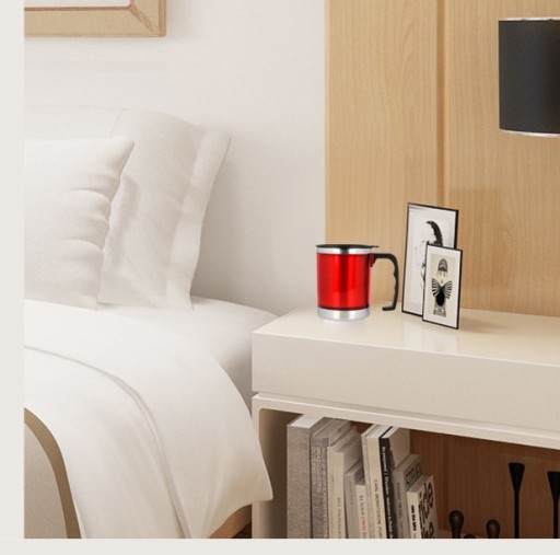 Термокружка, зверху закрита кришкою, внутрішня частина виготовлена з нержавіючої сталі.