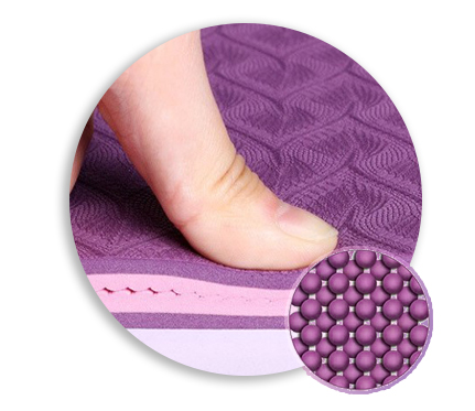 Килимок виготовлений з екологічного матеріалу TPE, який характеризується високою щільністю, міцністю на розрив і високою еластичністю, завдяки чому захищає хребет, стегна, лікті та коліна та зменшує тиск на суглоби. Забезпечує належну амортизацію. Після тривалого використання килимок зберігає свій початковий стан.