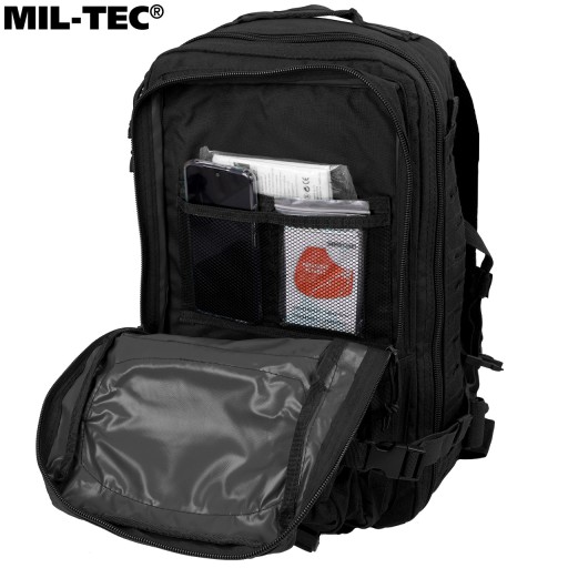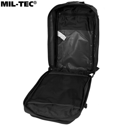УВАГА! Предметом пропозиції є рюкзак Mil-Tec Assault Laser Cut чорного кольору. Інші елементи використовуються для представлення функціональності.