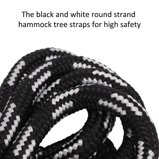 3. Високозахищений ремінь для гамака з деревом: чорно-білий двоколірний круглий ремінь для гамака з деревом має сильну термостійкість, стійкість до стирання, світлостійкість і стійкість до корозії, що забезпечує високу безпеку.