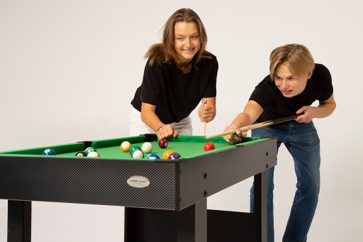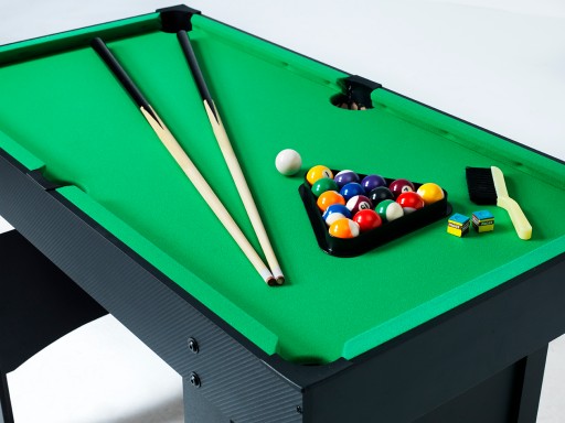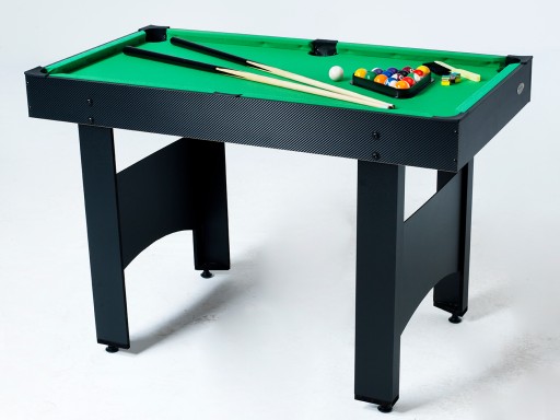 У коробці – стіл, один набір більярдних куль (кожен діаметром 38 мм), два киї, крейда, трикутник і пензлик.