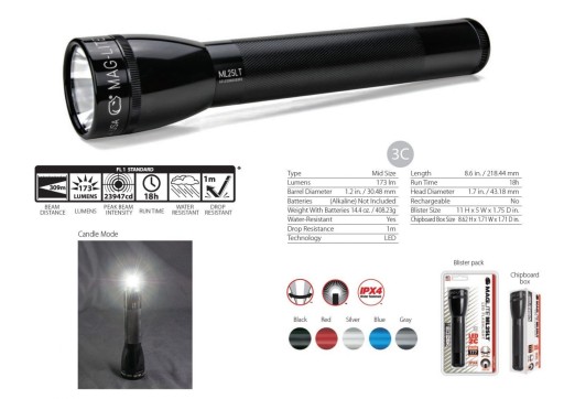 Maglite ML25LT поєднує в собі переваги компактних ліхтариків - розмір і вагу, з перевагами великих акумуляторних ліхтариків R20 - велику дальність світла і час освітлення в результаті більшої ємності акумулятора.