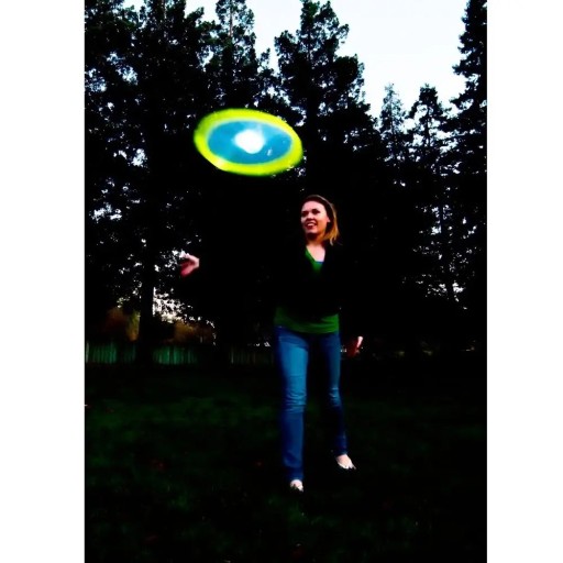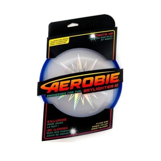Диск для метання фрісбі AEROBIE Skylighter Green подарує задоволення навіть у темряві. Дві світлодіодні лампи чудово підсвічують центр і напівпрозорі краї літаючої тарілки, тому ви добре бачите її навіть у темряві. Aerobie Skylighter діаметром 23 см летить прямо і точно завдяки вдосконаленій конструкції каблучка. Ця функція підтримує підйомну силу в центрі літаючої тарілки протягом усього польоту, що значно покращує стабільність польоту.