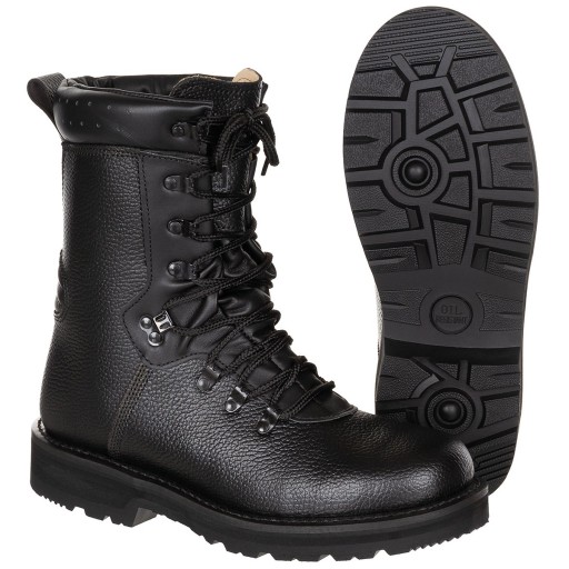 - В даний час використовується зразок черевиків в німецькій армії Якісні бойові черевики Бундесверу Верх з водонепроникної шкіри шкіряний язик Знімна устілка Підошва протиковзаюча, стійка до масла та бензину вставка: EVA (ізоляційна піна) Шнурки: поліестер Німецька компанія MFH