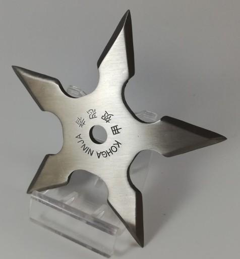 У пропозиції метальна зірка ніндзя з футляром. Він виготовлений з металу і має 5 рук. Кобура має петлю для пояса і може кріпитися на ремінь. Зірка зроблена міцно і ідеально підходить для навчання її метанню.