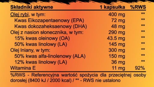 Риб'ячий жир, соняшникова олія, лляне масло, DL-α-токоферолу ацетат (вітамін Е), желатин (капсула), гліцерин (зволожувач), вода.