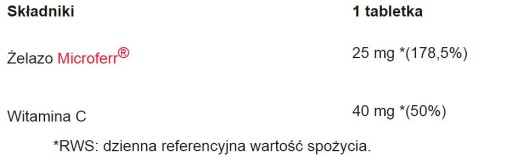 Залізо у формі Microferr® (фумарат заліза (II), пірофосфат заліза (III), речовина оболонки мікрокапсул (рослинні жири), наповнювачі (фосфати кальцію, мікрокристалічна целюлоза), L-аскорбінова кислота (вітамін С), анти- злежувач (діоксид кремнію).