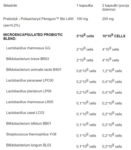 Інгредієнти: Пребіотик - полісахарид Fibregum™ Bio LAW (aw<0,2%), Lactobacillus rhamnosus GG ATCC 53103, Bifidobacterium breve BR03, Bifidobacterium animalis lactis BS01, Lactobacillus paracasei LPC00, Lactobacillus plantarum LP09, Lactobacillus rhamnosus LR05, Lactobac illus casei LC03, Bifidobacterium bifidum BB01, Streptococcus thermophilus YO8, Bifidobacterium longum BL03, бактеріальна оболонка: ефіри гліцерину жирних кислот, оболонка капсули (гідроксипропілметилцелюлоза).