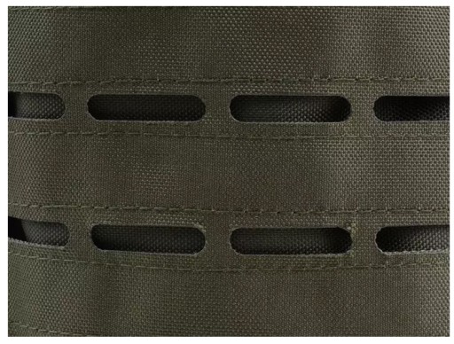 Замість традиційних лямок MOLLE, вшитих з зовнішньої сторони рюкзака, у зовнішньому матеріалі за допомогою лазера вирізані спеціальні отвори, через які переплітаються лямки MOLLE кишень і модульних сумок.