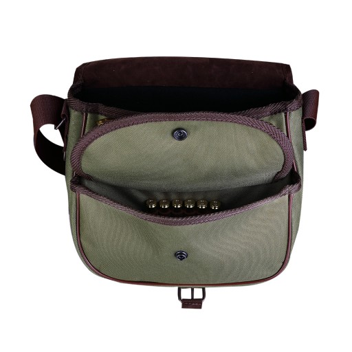 Практична та функціональна сумка для полювання класичного дизайну. В основі конструкції лежить одне основне відділення з додатковою кишенею. Під основним клапаном знаходиться підсумок для 8 патронів, а в передній кишені для кульових патронів - 6 штук. М'який і широкий регульований ремінь, обтягнутий шкірою, забезпечує комфорт при носінні.