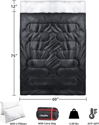 Подвійні спальні мішки для дорослих Ohuhu виготовлені з високоякісного водонепроникного поліестеру 210T, підбиті тканиною TC і наповнені порожнистою бавовною, що разом забезпечує комфорт, схожий на хмару.