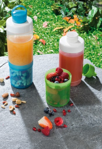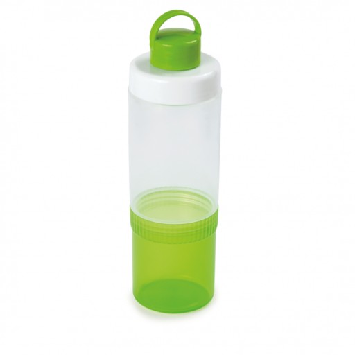 Завдяки універсальному використанню зелена пластикова пляшка з харчовим контейнером підходить для йогуртів, мюслі, салатів, фруктів, овочів і холодних супів.