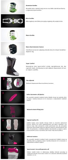 Ідеальний черевик для початківців і тих, хто навчається, яким потрібні легкі та зручні черевики. Вони відрізняються великим комфортом і легкістю знімання/надягання. Два матеріали з різною жорсткістю створюють одну легку конструкцію. Ця конструкція забезпечує достатню жорсткість для кращої стійкості під час їзди, а більш гнучка передня частина та язичок полегшують відкриття та надягання взуття. Спеціально профільований і занижений верх взуття враховує різну анатомічну будову жіночої ніжки. Комфортне внутрішнє взуття забезпечує тепло та комфорт протягом усього дня. Конструкція черевиків дозволяє встановити нову підошву з протектором GRIP WALK, що збільшує зчеплення та забезпечує комфортнішу ходьбу в лижних черевиках.