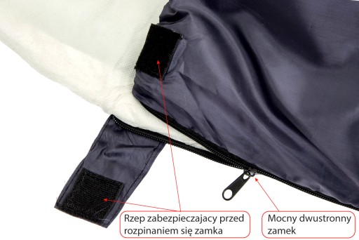 - Спальний мішок застібається на блискавку, закріплену липучкою для запобігання випадковому відкриванню.