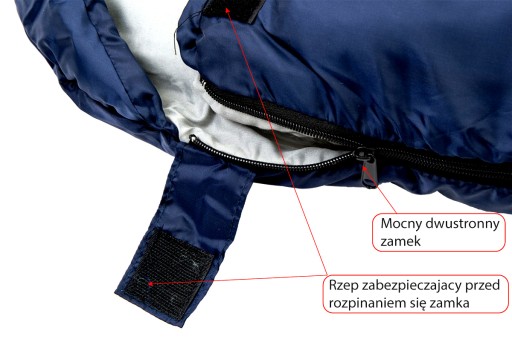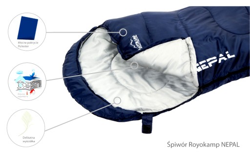 NEPAL NAVY SLEEPING BAG 210X80x50CM - практичний спальний мішок у формі мумії, звуженої донизу. Ідеально підходить для шкільних екскурсій, походів і сімейних подорожей під наметом. Він наповнений спеціальним поліефірним волокном щільністю 250 г/м2, яке не вбирає вологу, є антиалергічним, швидковисихаючим і легким, а спеціальна строчка по всій поверхні матеріалу спальника запобігає його зсуву. Капюшон на шнурку дозволяє вільно регулювати його ширину і захистить голову від холоду. Форма мумії довше зберігає тепло всередині та адаптується до вашої форми.