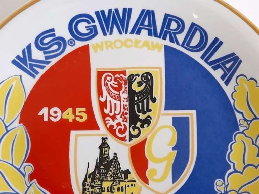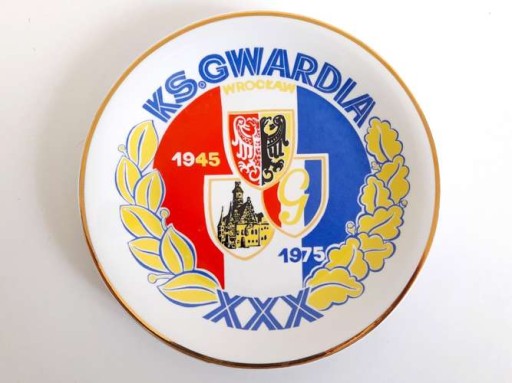 Стан: ДУЖЕ ДОБРИЙ: Офіційна, пам'ятна порцелянова тарілка, видана за часів Польської Народної Республіки спортивним клубом Gwardia Wrocław з нагоди свого 30-річчя (1975). На ній намальовано назву та герб клубу, а також герб міста Вроцлава та малюнок будівлі ратуші Вроцлава. Тарілку виготовив порцеляновий завод Wawel з Валбжиха. З іншого боку маркування заводу і цифри 164 і 10. Також є тримач для підвішування таблички на стіну.
