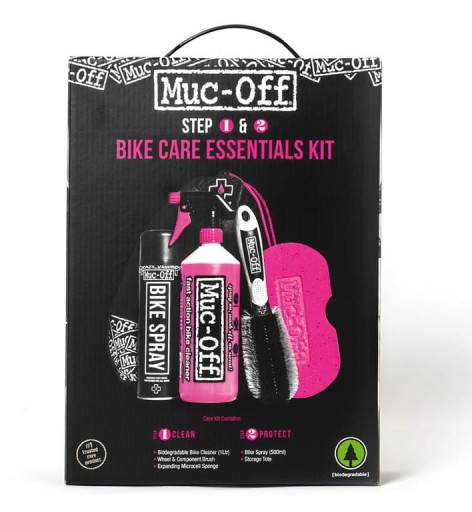 Набір Muc-Off Bike Care Essentials містить усі основні предмети, необхідні для чищення велосипеда. У набір входить засіб для чищення велосипеда Nano Tech, захист для велосипеда, щітка для обода та спиці колеса та компонентів, губка та зручна сумка для зберігання. Набір можна використовувати для всіх типів велосипедів. Nano Tech Bike Cleaner можна безпечно використовувати для всієї поверхні велосипеда. Його також можна використовувати на поверхнях з вуглецевого волокна. Засіб біологічно розкладається і не містить фреонів, розчинників і кислот. Захисний засіб, що входить в комплект, відмінно видаляє зайву вологу, запобігаючи утворенню іржі та корозії.