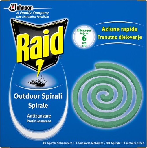 Спіралі Raid® з інсектицидною дією проти звичайних і тигрових комарів для зовнішнього використання. Спіраль використовується тільки на відкритому повітрі, її можна розташовувати в безпосередній близькості від будинків, на балконах, терасах і т. д. Одна спіраль працює близько 6 годин на площі 10 м3. В упаковці 10 спіралей і одна металева опора.