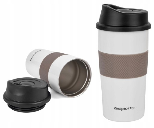 Чорна термокружка Konighoffer Elliot 440 мл має пластикову кришку, оснащену зручним мундштуком і застібкою-застібкою. Напій не проллється за кермом, велосипедом або пішки. Улюблену каву ви візьмете з собою в дорогу, на роботу чи на пікнік.