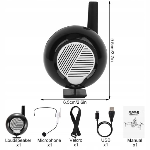 7. Підходить для різноманітних продуктів, портативний і легкий динамік становить лише близько 56 ГБ, може бути встановлений на різних транспортних засобах, таких як дрон, радіоуправляний автомобіль тощо, щоб розмовляти в окремому місці, довільне керування, малий розмір, легка вага , не впливає на політ безпілотника.