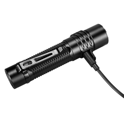 Вимикач розташований з протилежного боку від світлового потоку. Крім того, ліхтарик оснащений боковою функціональною кнопкою з діодом, який інформує користувача про рівень заряду батареї - миготливий діод вказує на стан батареї нижче 10%, червоний діод вказує на стан батареї нижче 30%, помаранчевий діод вказує на 30% - 70%, а зелений діод вказує на 70% - 100%.%.