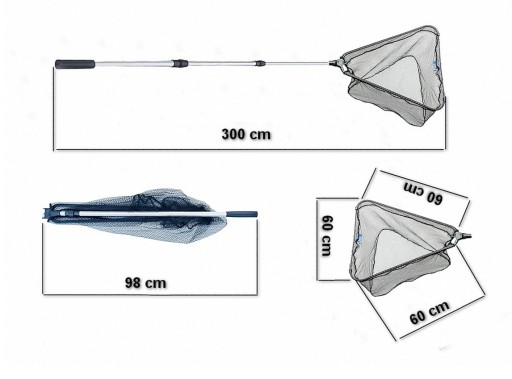 - Сачок довжиною 300 см складається з 3 елементів і має розмір 100 см у складеному вигляді.