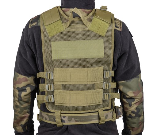 Жилет виготовлений з нейлонової сітки. Має три ремінця в бічних частинах, які регулюють його розмір. На спині три смуги шириною 50 мм. Жилет розділений на дві частини і застібається на блискавку. На правому клапані є три одинарних стандартних підсумки для магазинів Stanag і зручна кишеня на липучці для кріплення латки.