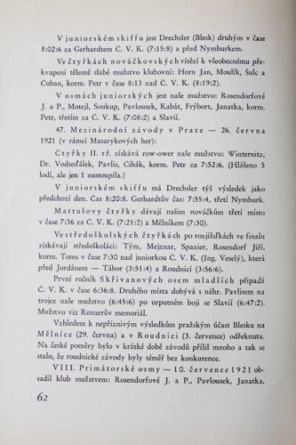 Блеск (зокрема Йозеф Росслер-Оровський, Феррі Яніс, д-р Богумір Сладек). В окремих текстах описуються різні події та періоди з перших 50 років діяльності клубу. Це включає: участь у престижних регатах, а й веслувальний туризм та створення спортивної бази клубу у вигляді пристані.