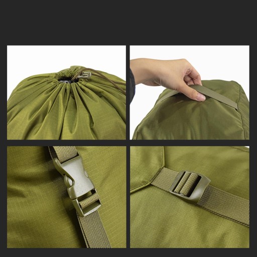 [ФУНКЦІЯ]: компресійний мішок для спального мішка, захистить ваш одяг від проливання, регульована стрічка та міцна пряжка, пряжку легко вставити, натисніть, щоб затягнути. Низ оснащений ременем для перенесення, який зручніше носити.