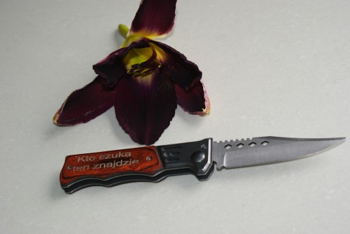 Пропонує елегантний перекидний ніж із вашим гравіюванням у коричневій дерев’яній коробці з гравіюванням.