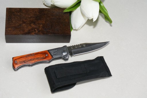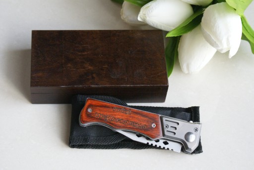 Пропонує елегантний перекидний ніж із вашим гравіюванням у коричневій дерев’яній коробці з гравіюванням.