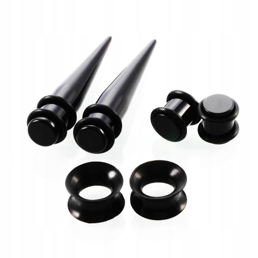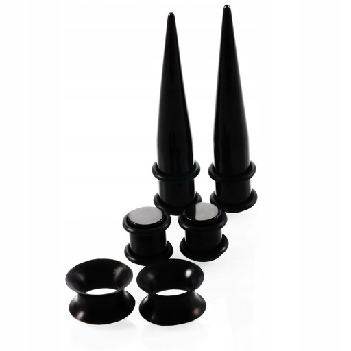 Акрилові конуси та пробки з подвійними ущільнювальними кільцями, відстань 14G (1,6 мм), 12G (2 мм), 10G (2,4 мм), 8G (3,2 мм), 6G (4 мм), 4G (5 мм), 2G (6 мм), 0G (8 мм), 00G (10 мм).