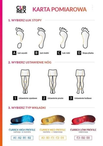 Currex Run Expert є розвитком моделі Run Pro. Модель Run Expert, як випливає з назви, призначена для бігунів. Бігові устілки завдяки своїй унікальній анатомічній формі та 3 різним типам залежно від типу стопи дозволяють кросівки краще прилягати до стопи. Це забезпечує максимальний комфорт і зручність, а також стабільність. Ергономічна форма, особливо в області п'яти, дозволяє дуже добре підходити до форми стопи. Ви можете відчути різницю, коли вперше одягнете його! Крім того, вставки в черевики ідеально поглинають удари та удари, викликані ударами об землю. Це підвищує захист суглобів і м'язів від травм і підвищує комфорт бігу. Використані матеріали та форма устілки запобігають руху стопи у взутті та відводять вологу назовні, що значно знижує ризик появи мозолів, потертостей або натирань. Спеціальна конструкція, посилена в області плеснової кістки, дозволяє використовувати динамічну підтримку підошовної фасції і зводу стопи під час бігу, що впливає на комфорт і правильне положення стопи під час фази відштовхування і приземлення. Модель Run Expert відрізняється від моделі Run Pro двома найважливішими моментами. Перша - це система Neuo-Dots-Gel - це силіконові виступи, розміщені в області п'яти. Вони запобігають руху стопи у взутті та забезпечують ще кращу стійкість. Другий схожий на Fast-Gel-Dots, розміщений під великим пальцем ноги. Маючи стимулюючу дію, він покращує сприйняття і впливає на краще відчуття землі і, як наслідок, на більш сильний і швидкий зліт. Устілки для бігу Currex Run Expert виготовлені з еластичних і гнучких матеріалів, що дозволяє збільшити динаміку відбиття і краще поглинати удари, а також жодним чином не обмежує роботу стопи. Щоб правильно вибрати вставки, дивіться малюнок нижче.