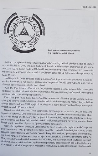 : Книга, присвячена автопробігу, організованому в 1937 році т.зв. Мала Антанта, тобто Чехословаччина, Румунія та Югославія. З Праги, яка була стартовою точкою перегонів, стартували 73 автомобілі та 58 мотоциклів, завданням яких було подолати маршрут довжиною понад 2400 кілометрів через Братиславу, Бухарест і Белград. Зрештою, 63 автомобілі та 40 мотоциклів дійшли до фінішу в тодішній Югославії.