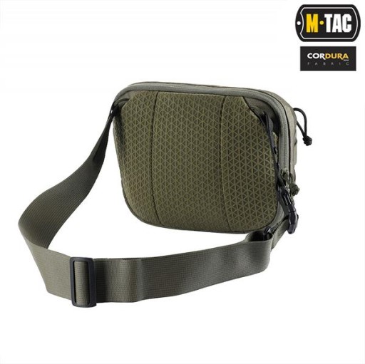 Дана модель сумки має регульований плечовий ремінь, що дозволяє носити її як на плечі, так і на поясі. Продумані відділення вміщають мінімум необхідних речей, а сумка додатково оснащена відділенням для прихованого носіння зброї зі швидким доступом. Дизайнери M-Tac змінили розташування передньої кишені, додавши стильний шестикутник з логотипом компанії. З обох боків сумки є ремінці MOLLE для кріплення додаткового обладнання. Задня частина сумки оснащена м'якою і повітряною сіткою з отвором для телефону.