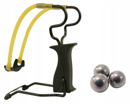 Міцна рогатка з упором для передпліччя, що полегшує утримання натягу. Висока кінетична енергія, точність і дальність. Рогатка, призначена для метання сталевих і керамічних кульок діаметром приблизно 10 мм.